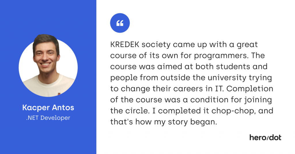Kacper is one of our brightest and most promising .NET Developers. Before his story with hero/dot began, Kacper (a student of Politechnika Wrocławska) was a member for 4 years and the head of the KREDEK science club for 3 years. It was in a circle of enthusiasts for programming web and mobile applications that he excelled at programming skills.